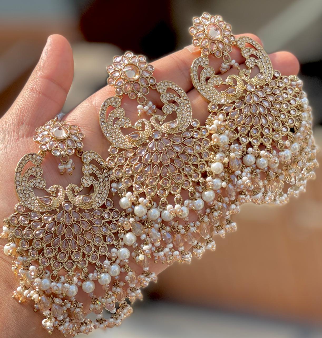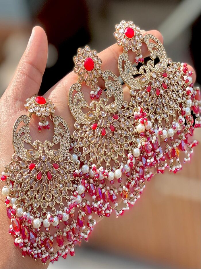 Elevate your bridal or festive look with this exquisite Kundan Tikka and Chandbali Earrings Set. Designed with shimmering stones, rich ruby-pink accents, and elegant pearls, this piece adds timeless royal charm to any traditional outfit.